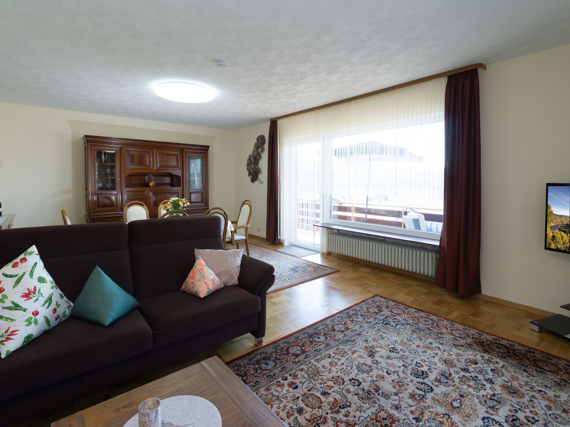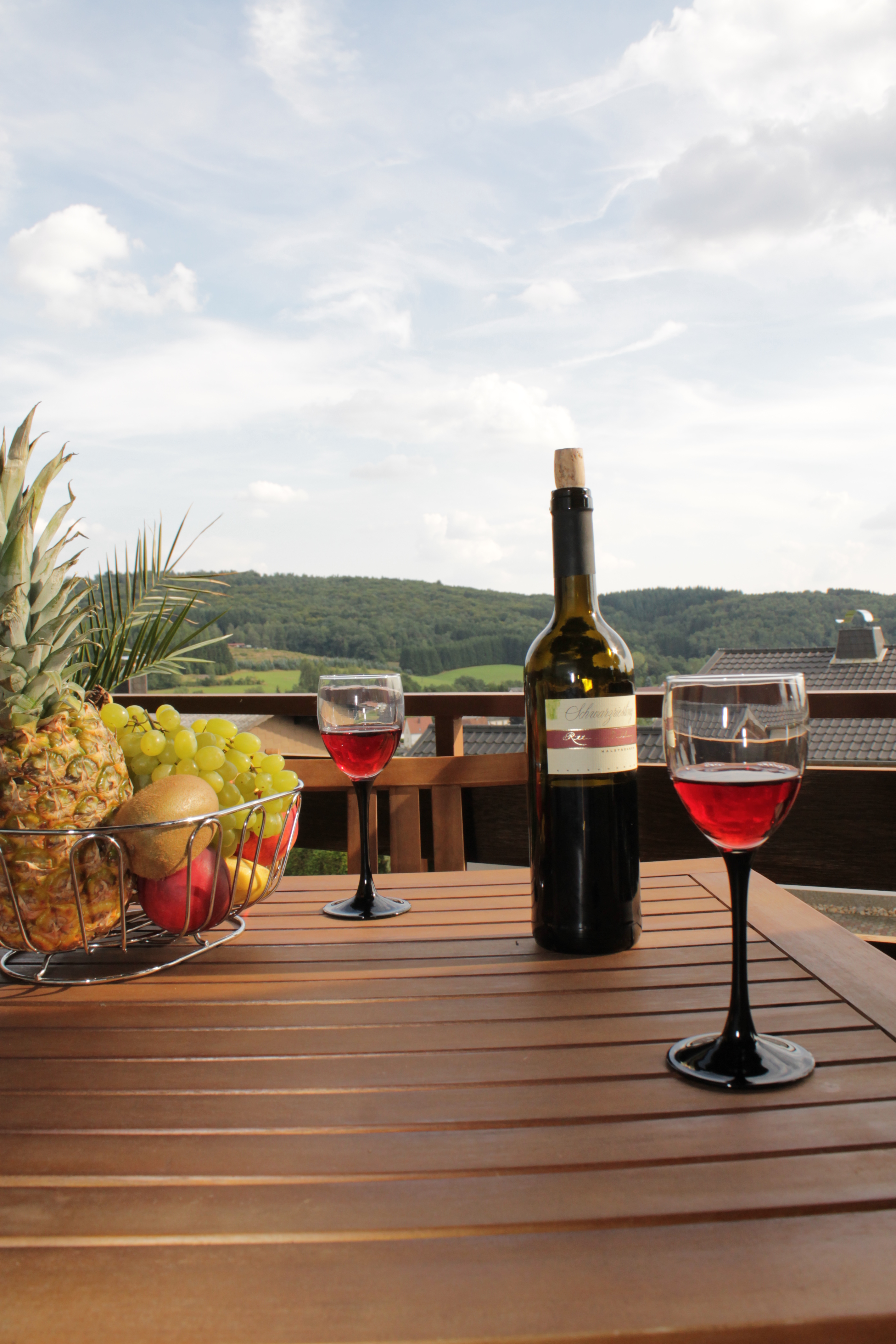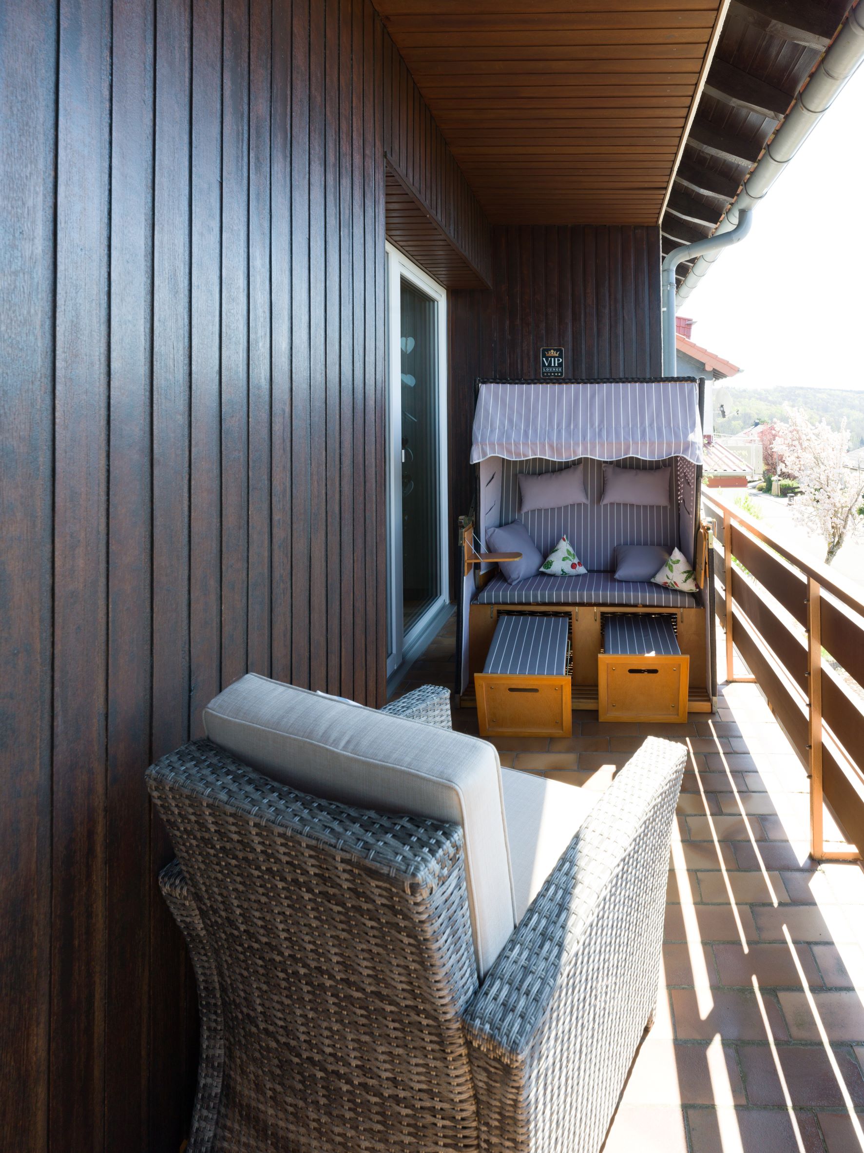 Wohnzimmer mit Zugang auf den Balkon, dort finden Sie Erholung im Strandkorb und können den Blick über das Nahetal schweifen lassen.
