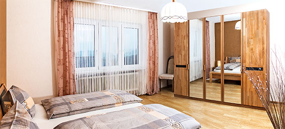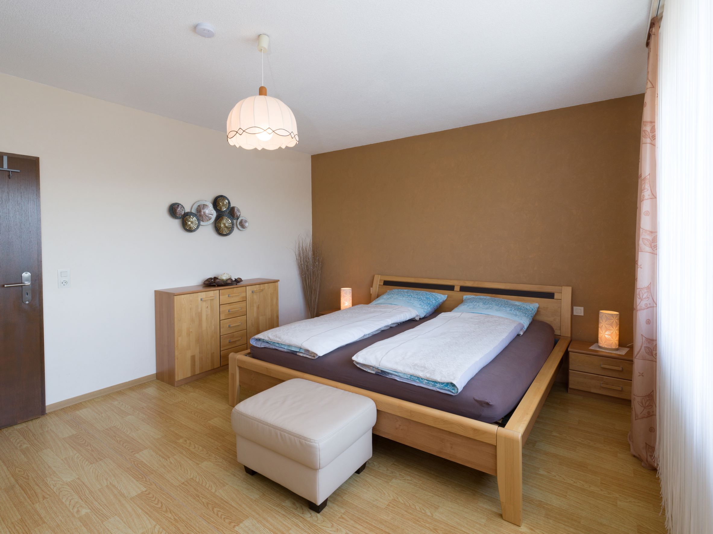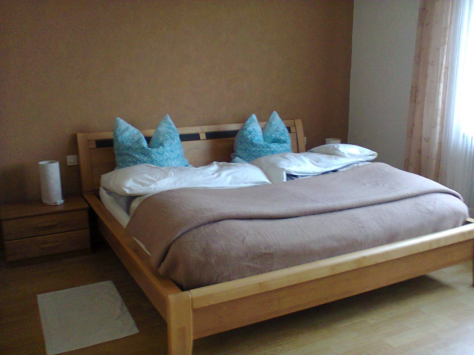 Schlafzimmer Doppelbett 200 x 200 cm Bettwäsche ist vorhanden, Betten sind bezogen. Kopf- und Fußteil der Lattenroste sind manuell verstellbar.